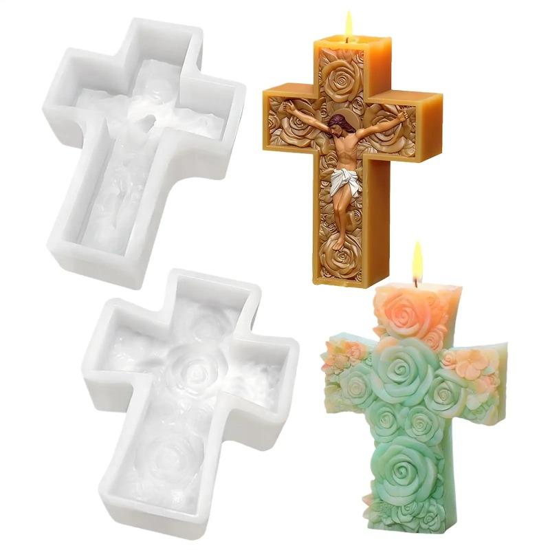Bloemkruis Jezus Siliconen Kaarsvorm 3D Reliëf Rozenpatroon Kruis Ambacht Gips/Hars/Zeep Vorm Religieus Ornament Maakgereedschap