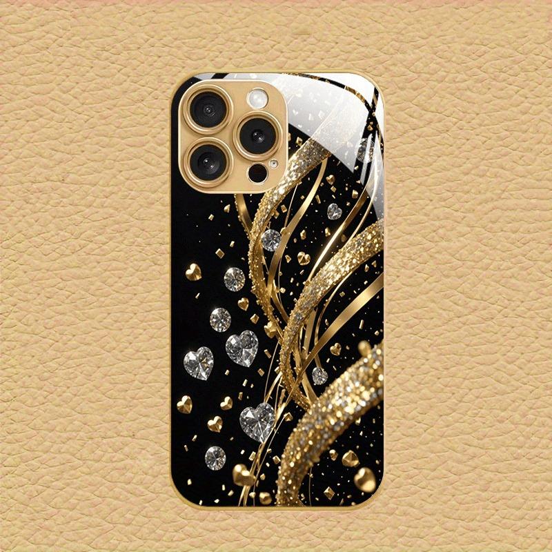 Goud Diamant Hartpatroon Gouden Metallic Verf Glazen Telefoonhoesje Voor iPhone 17 Pro Max 11 12 13 14 15 16 Plus 17 Air 16E Cover