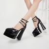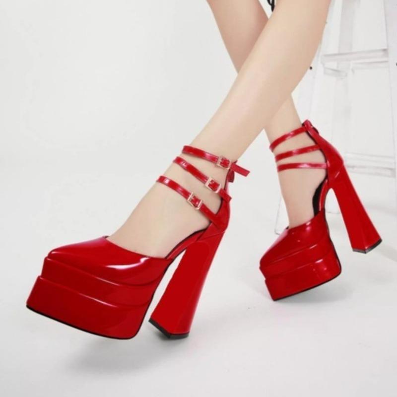 Pointed Toe Patent Leather Buckle Strap Block Heel Single Platform Super High Heel Women's Shoes