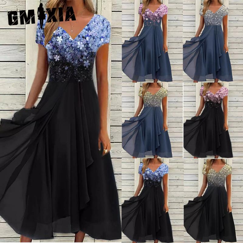 GMXIA Damesmode Zomer Lente Korte Mouw V-Hals Casual Jurken