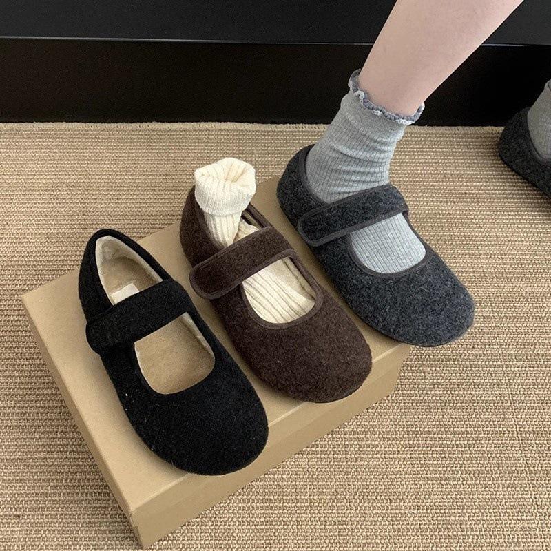 Korean Velcro Mao Mao shoes winter wear velvet single shoes warm cotton shoes flat Mary Jane Doudou shoes