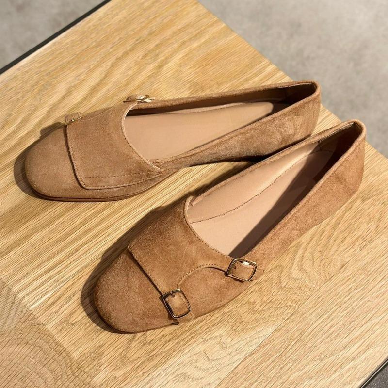 Vintage Brown Faux Suede Low Heel Pumps Women Luxury Metal Buckle Embellished Designer Shoes Lightweight Soft Sole Flat Loafers