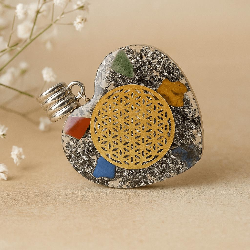 Crafted in a transparent resin matrix, fine silver-toned metallic shavings and multicolored gemstone chips are suspended within, while a central gold-toned insert holds the precise flower of life pattern. The heart shape speaks to compassion and care. The flower of life — a timeless motif of overlapping circles — is widely regarded as a symbol of harmony, interconnectedness, and the continuity of life. A spectrum of seven hues nods to the chakras in yogic tradition, often used as a simple reminder of balance and alignment in daily life. The mixed-metal look, a silver-toned coiled bail, and the slightly domed profile give it a refined, tactile finish. 🌈
