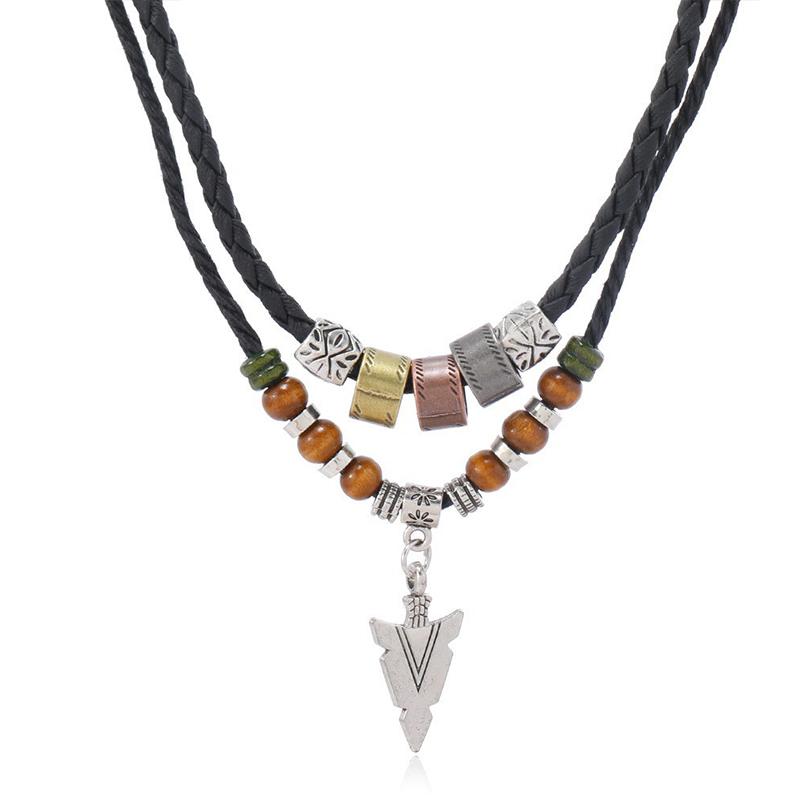 Vintage Arrow Pendant Layered Necklace - Black Braided Leather Chain with Mixed Beads,Retro Boho Style Jewelry for Men/Women