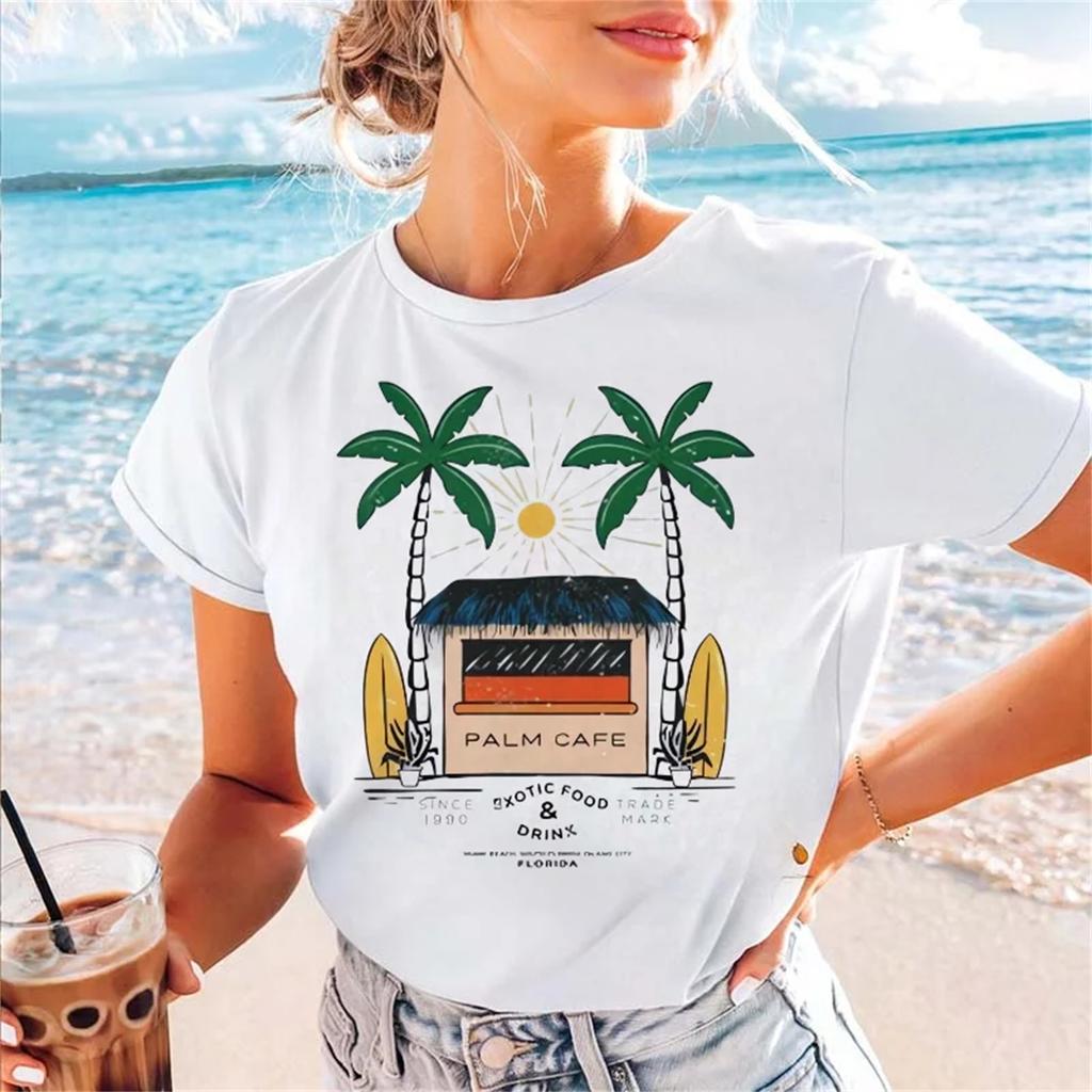 Cute T-Shirt Short Sleeved Beach Vacation Casual Print Women's Fashion Style O-Neck Summer Top Pattern Beach Travel T-Shirt