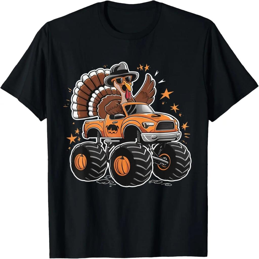Funny Turkey Riding Monster Truck Kids Thanksgiving Day T-Shirt