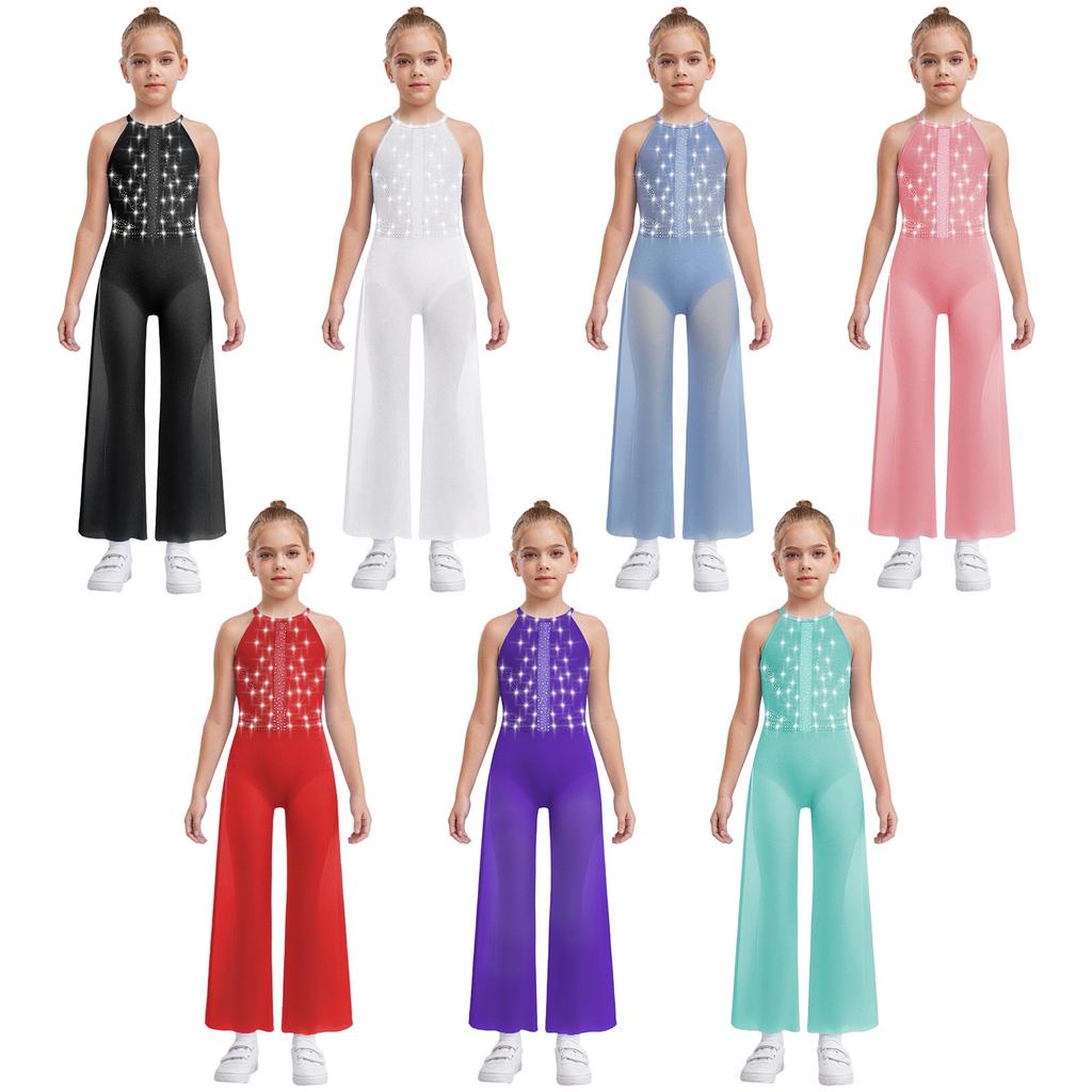 Kids Wijdpijp Dans Jumpsuit - Strass Glitterende Bodysuit met Keyhole Rug & Ingebouwd Ondergoed voor Optredens