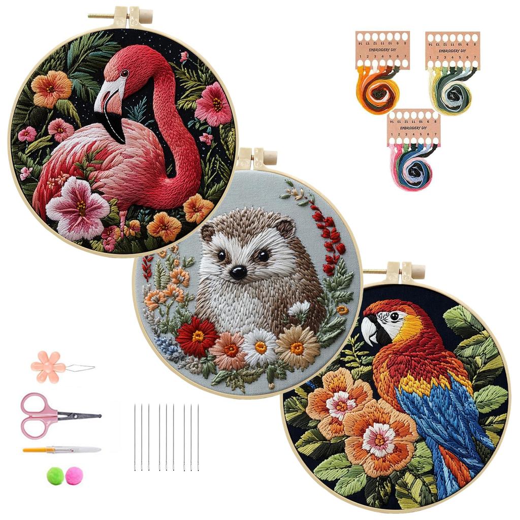 【Needlework Sewing Starter Kit】Includes three 6-inch embroidery hoops, three pre-printed fabrics (approximately 10x10 inches), thread, needles, English instructions, and other accessory tools.