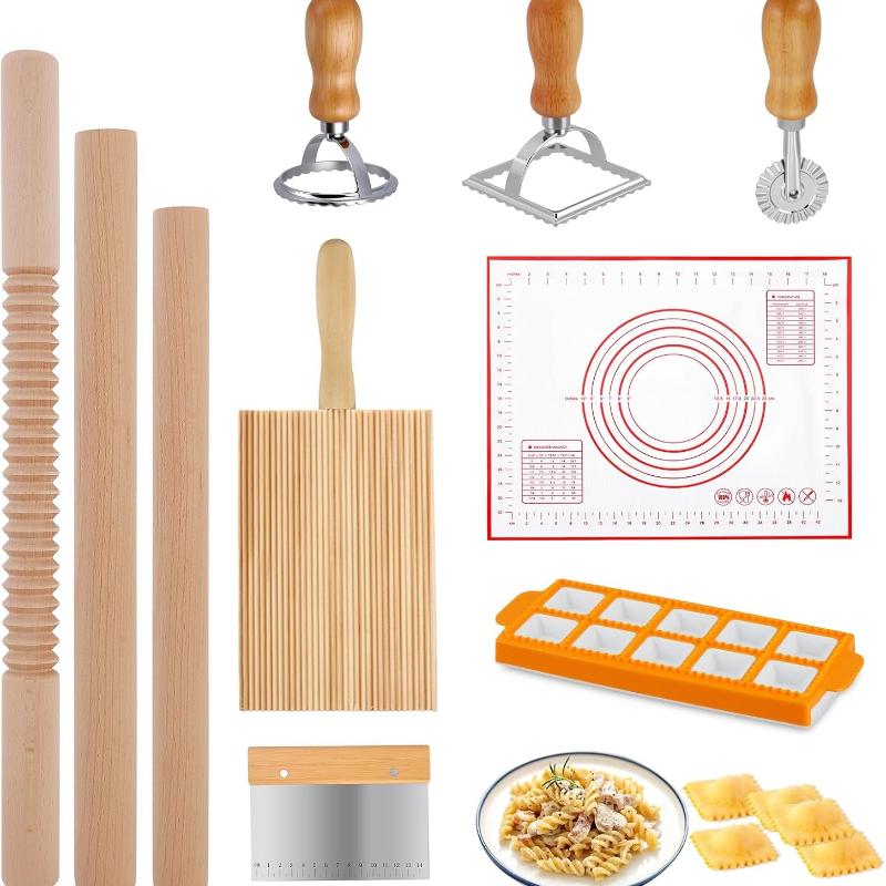 Pastamaker Set 10 Delen, Houten Pastamaker Gereedschap met Deegroller & Plank, Ravioli Stempel en Dumpling Ravioli Vorm Kit voor Italiaanse Pasta, Ravioli