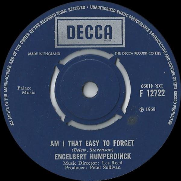 7inch Record ENGELBERT HUMPERDINCK Am I That Easy To Forget F12722 DECCA 1968 UK Pop Used