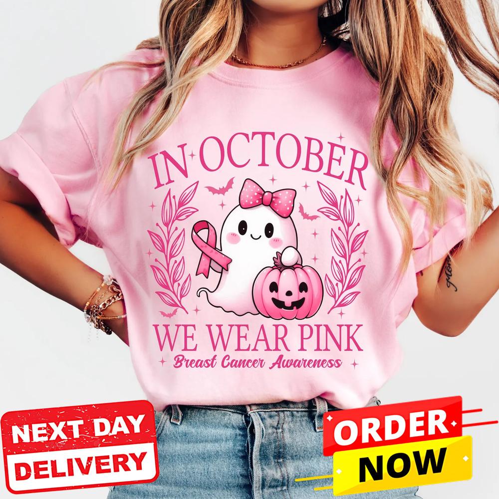In Oktober Dragen We Roze T-shirt Schattige Geest Borstkanker Bewustzijn Halloween Tee Unisex T-shirt
