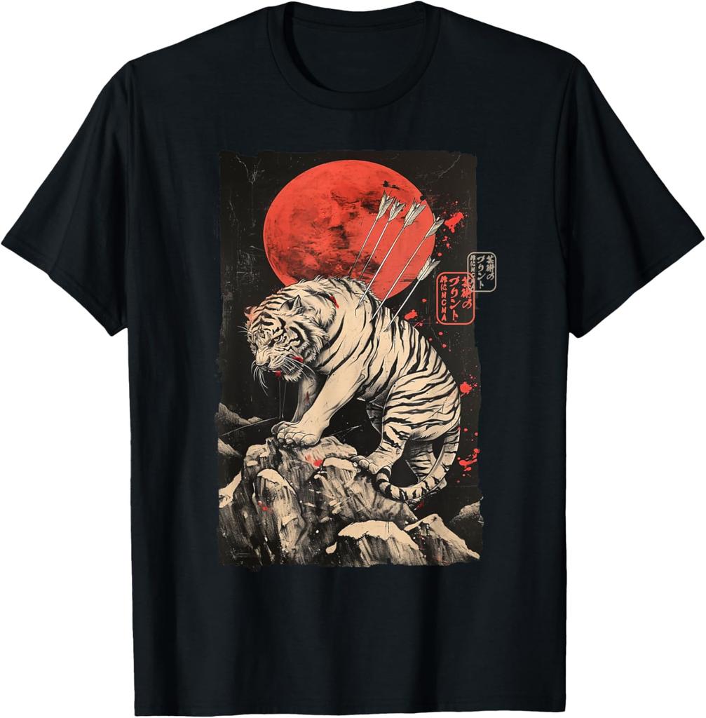 Wounded Tiger with Arrows Japanese Art Graphic Tee Mens Casual Round Neck TShirt Breathable Print