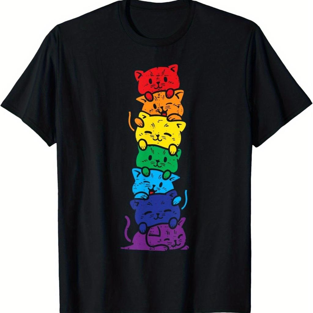 Rainbow Cat Stack Pride LGBT Gift Graphic Tee Cute Animal Lover Casual Short Sleeve TShirt