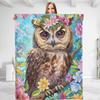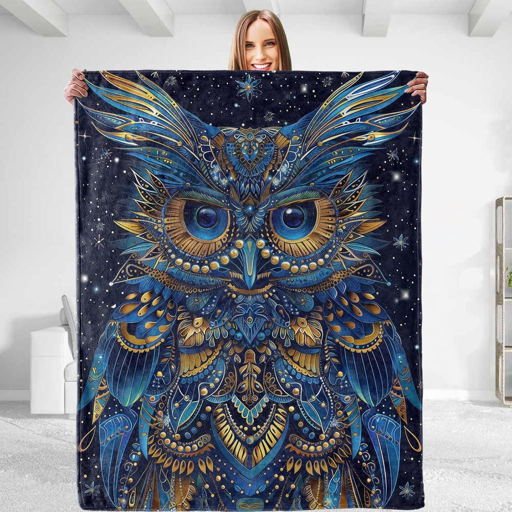 Owl blanket cosmic design blue gold pattern mystical art soft throw boho decor bedroom textile spiritual home accessory