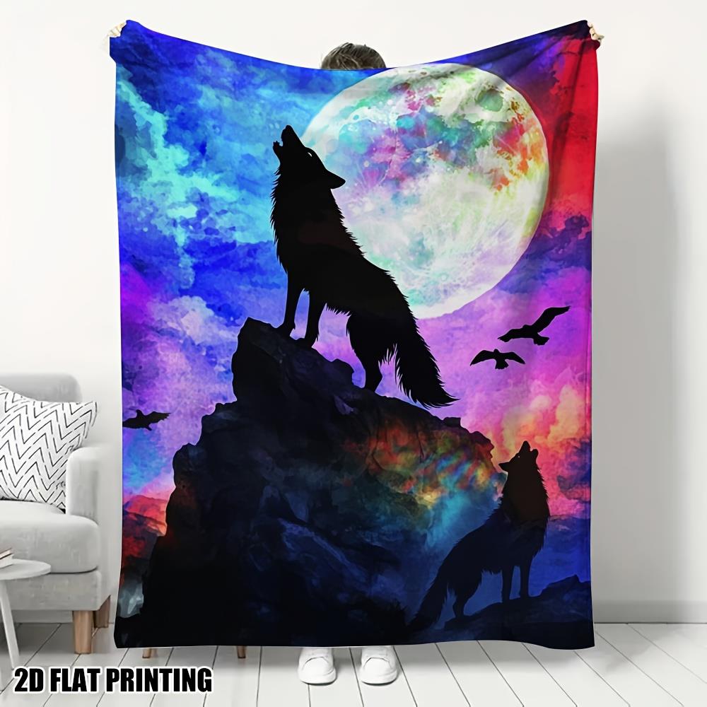 1pc Twin Size Wolf & Moon Night Sky Blanket - Black & Blue Wolf Pack Howling at Full Moon Print, Plush Soft Flannel Bedding