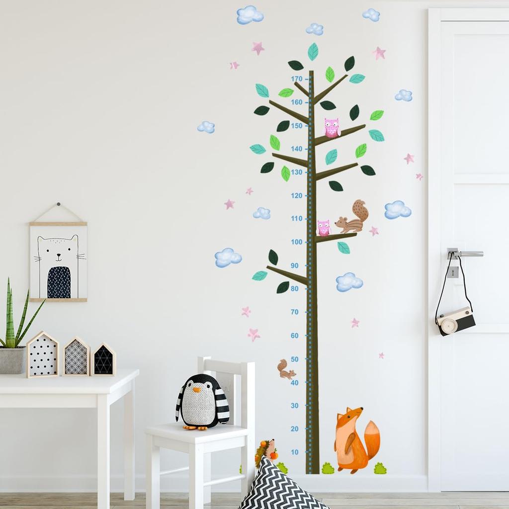 This adorable height chart wall sticker features a tree and animal motif, allowing you to keep track of your child's growth in a fun way. It measures up to 170cm and features a gentle design featuring adorable animals like foxes, squirrels, and owls, along with clouds, stars, and green leaves. Crafted from high-quality PVC, it features a matte finish for a sophisticated look. It's easy to apply to a variety of surfaces, including walls, glass, and tiles, and can be positioned freely. Its waterproof coating ensures long-lasting cleanliness. The removable stickers are safe for renters, allowing you to remove them cleanly without damaging walls when moving. A practical addition to any child's bedroom or playroom, this fun and practical piece allows you to keep track of your child's growth.