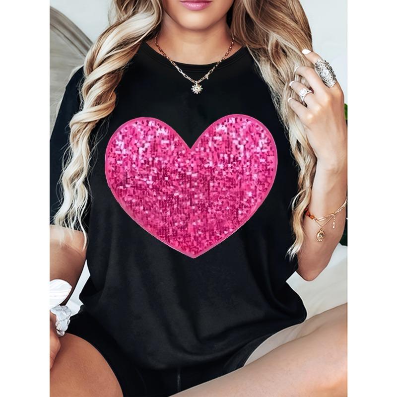 Europese Maat Zomer Verhoog de Inzet Dames Crewneck T-shirt. Sprankelend Glitter Hart Ontwerp, Luchtig