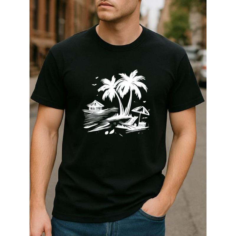 European sizes Beach Resort-style Printed, Lightweight Round-neck Short-sleeved, All-season Casual Men's T-shirt, Men's Casual Short-sleeved
