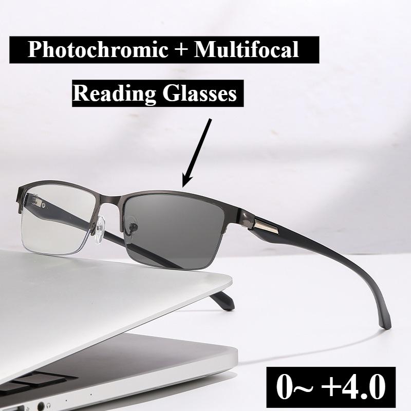 1/0~+4.0 Photochromic Multifocal Reading Glasses Automatic Zoom Half Frame Business Glasses Multiple Uses