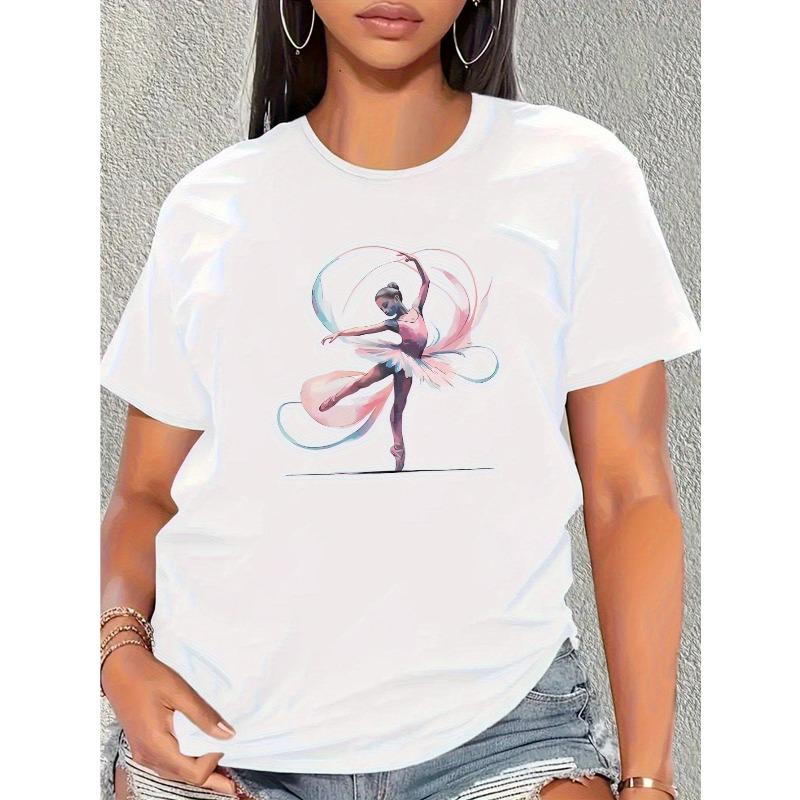 European Size Women'S White T-Shirt with Graceful Ballerina & Pastel Ribbons Graphic