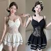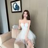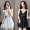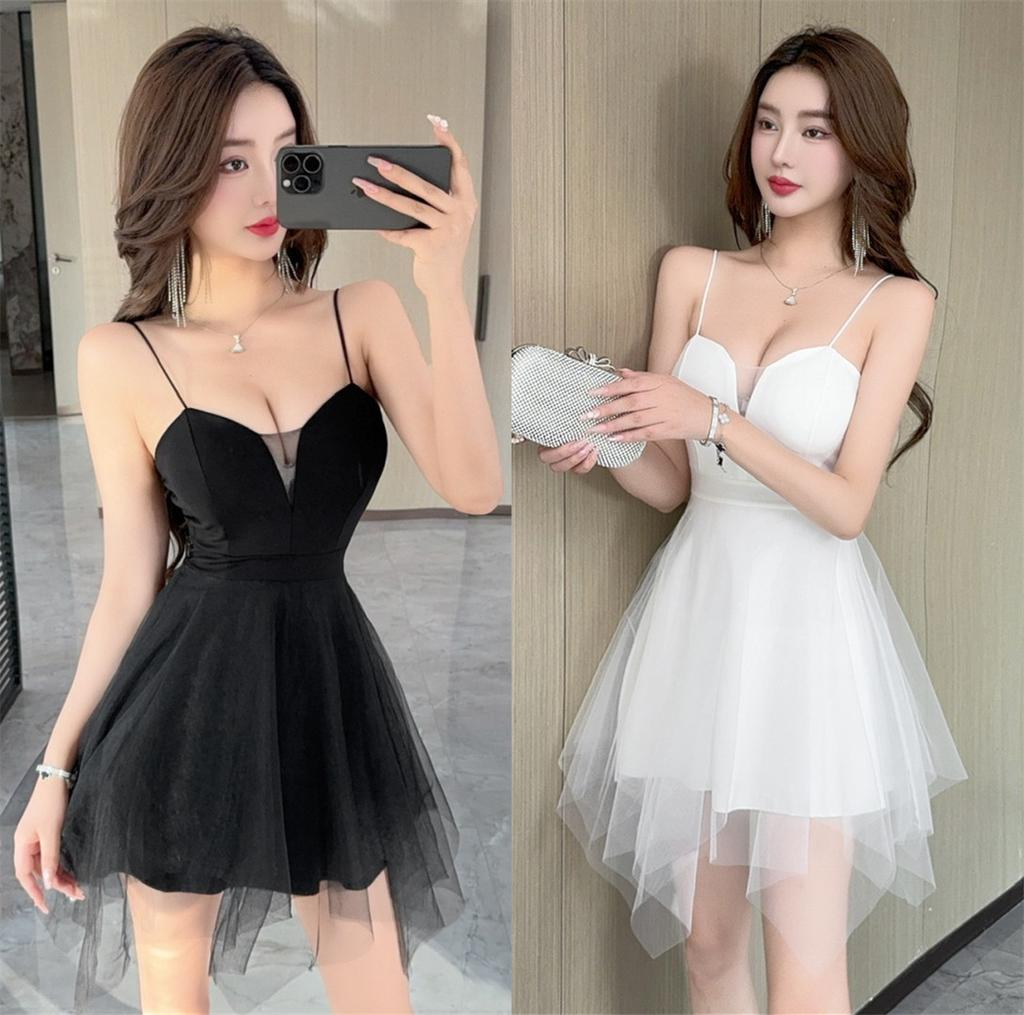 Autumn and winter new solid color sexy women's clothing low-cut mesh splicing suspenders slim-fitting big swing small short dress