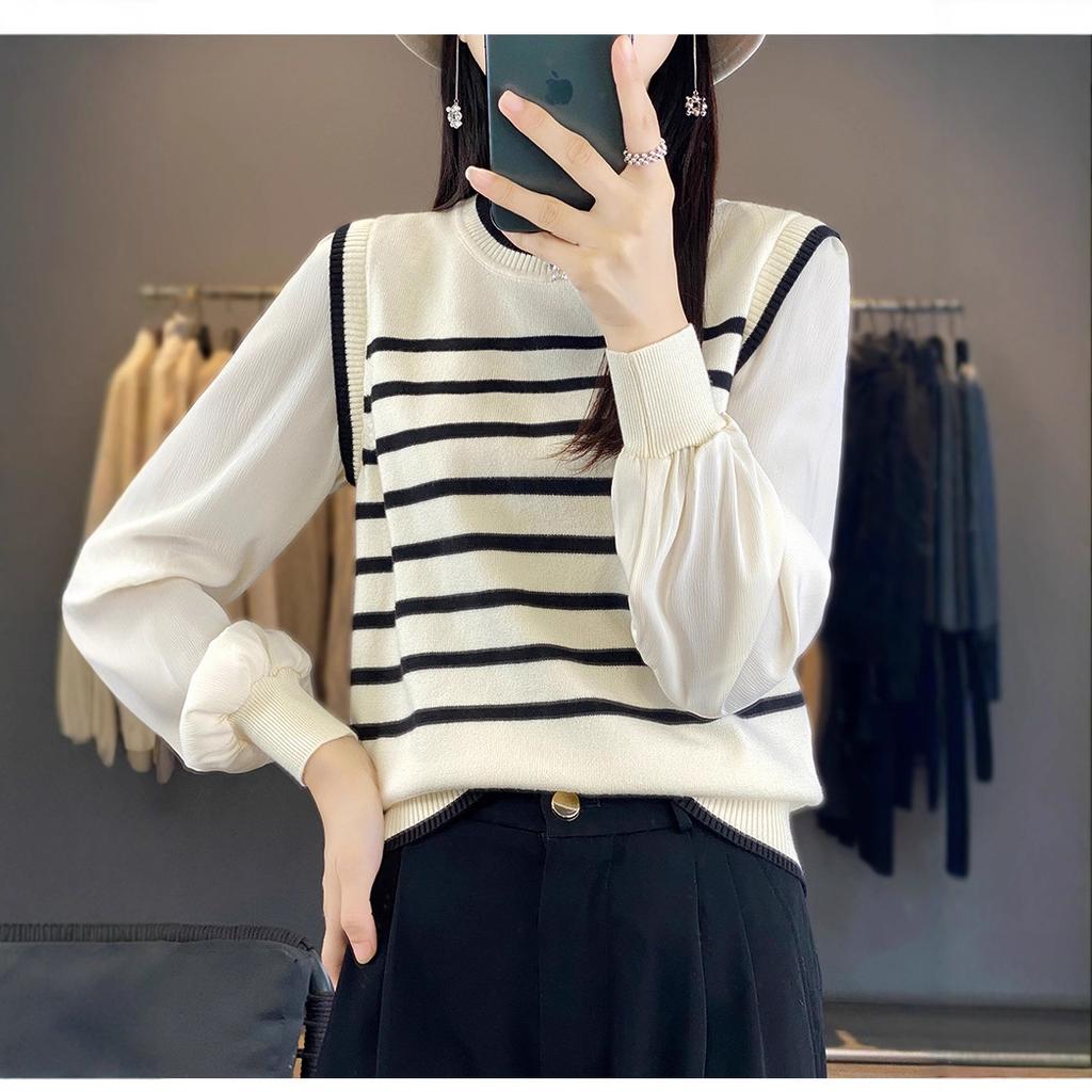 Women's fake two-piece knitted sweater spring new long-sleeved retro striped pullover top