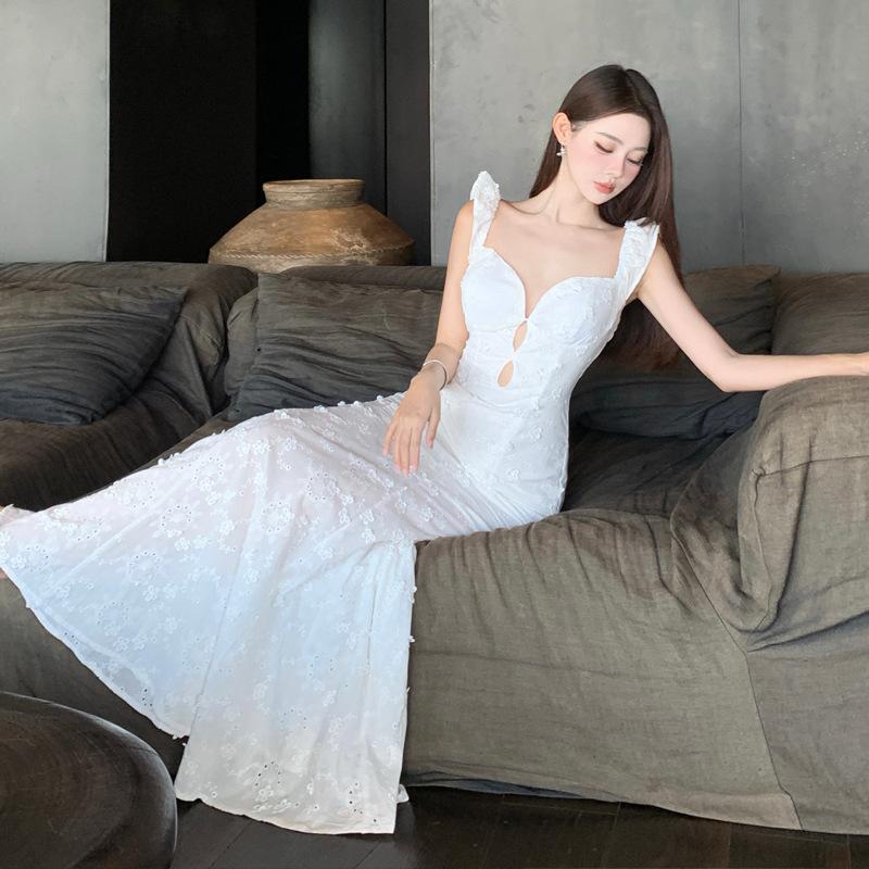 Flowing Mist, Flower Branch Xia Xin Cream White French Lace Slim Flower Dress Women's Summer Vacation