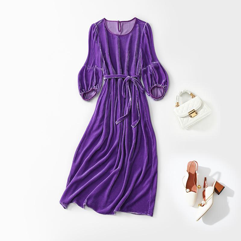 Silk Velvet Women's Dress with Belt & 3/4 Sleeves - Autumn Winter Collection