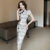 Introducing a stylish and sophisticated dress perfect for summer occasions. This slim fit midi dress is crafted from high-quality polyester, designed to be both comfortable and flattering. The dress features a beautiful floral pattern, adding a touch of elegance to its modern design. It is adorned with classic frog buttons and includes a stand collar for a traditional yet chic look. A side slit enhances mobility while adding a subtle touch of allure, making this dress a versatile and graceful addition to your summer wardrobe.