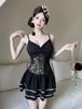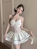 Small sexy backless V-neck suspender dress women's summer lace stitching waist and thin ruffle edge short skirt