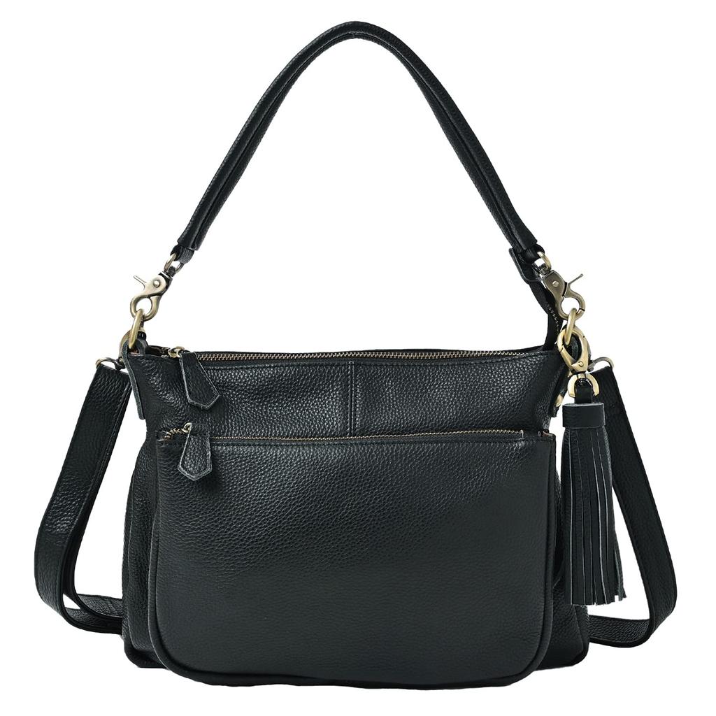 This bag comes with two leather straps, short and long, and can be worn as a crossbody or handbag. It's a popular women's leather bag for everyday use, commuting, and travel. The hardware is available in gold or black.