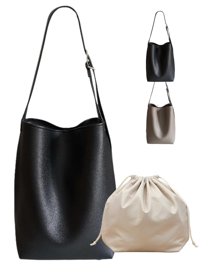 Women's A4 Tote Bag, Vertical, Faux Leather, Shoulder Bag with Drawstring, Laptop Storage, One-Handle, Unisex, Black