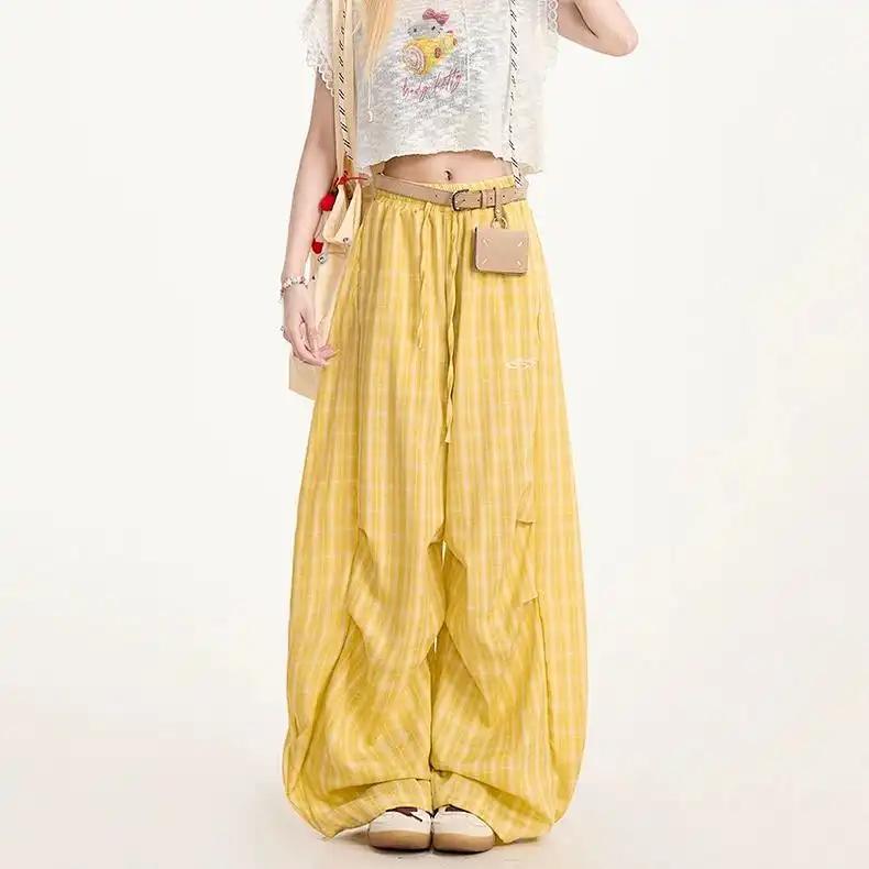Dames Gele Gingham Ballonbroek Hoge Taille Oversized Casual Broek met Elastische Taille