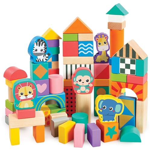There are many ways to play with the blocks, such as assembling, stacking, and counting, making them ideal for learning colors and shapes. The 5 animal blocks depict a giraffe, elephant, lion, monkey, and zebra, and are easy for small hands to handle. The set also includes 75 blocks with various shapes and patterns, allowing children to sort by color or search for shapes.