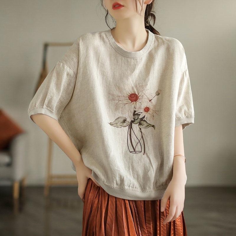 Summer Retro Cotton Linen Tops Women Cotton Large Size T-shirt Polo Neck Loose Printed Casual Pullover T-shirt Top