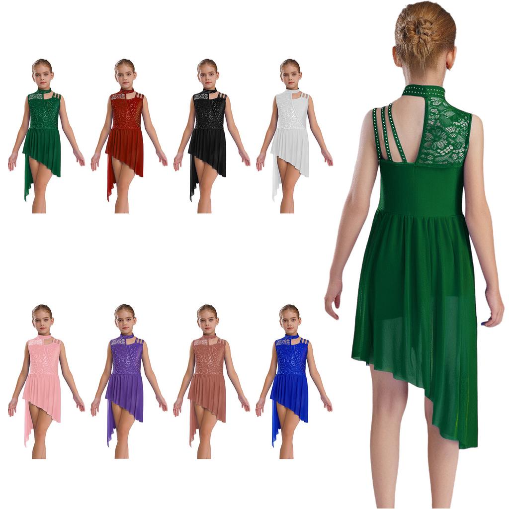 Meisjes Dans Leotard Jurk – Mouwloos Hoge Hals, Bloemenkant & Strass Steentjes, Asymmetrische Schouder & Onregelmatige Zoom voor Ballet & Lyrisch