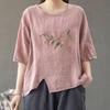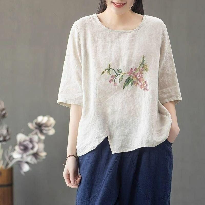 Cotton and Linen Blouse Women's Summer Plus Size Women's Chinese Ethnic Style Embroidery Literary Retro Season T-shirt Thin and Loose