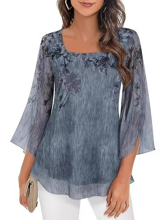2026 Spring/Summer V-neck Temperament Print Three-Quarter Sleeve Irregular Top