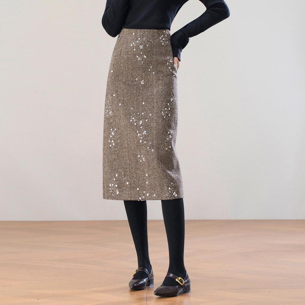 2025 Winter Elegant High-Waist Mid-Length Sequin Wool Slit Skirt for Women