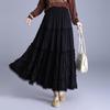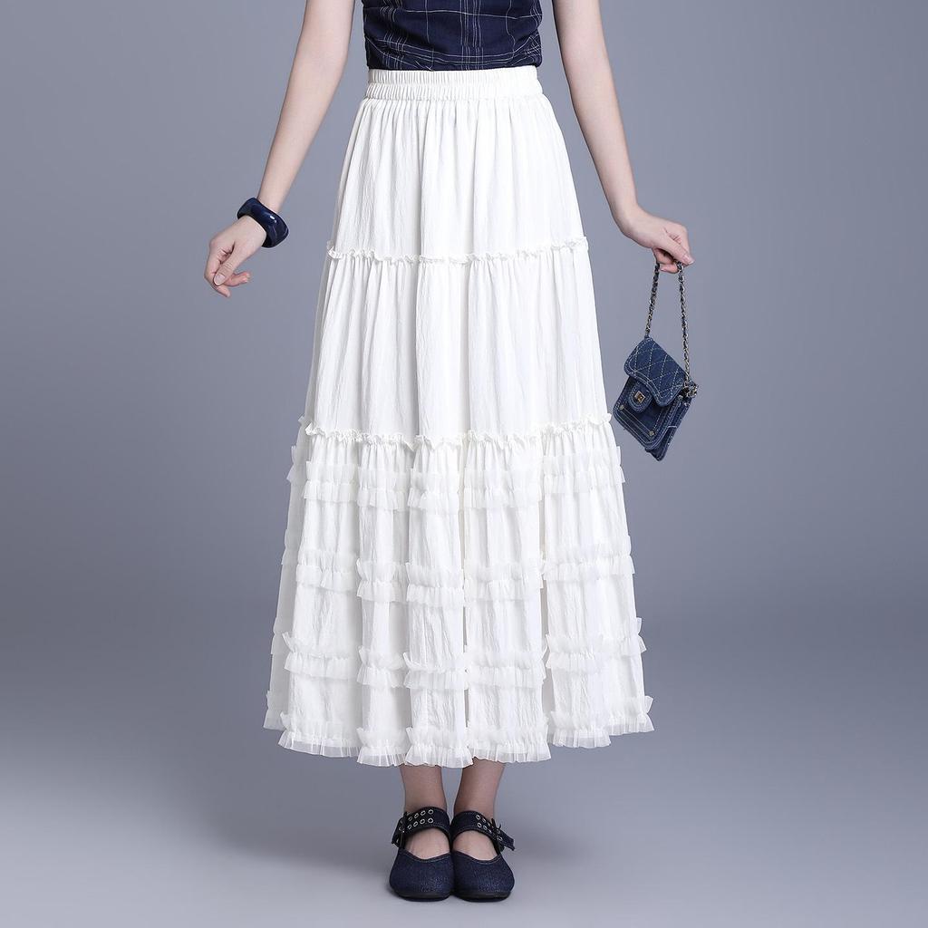 2026 Summer Women's Korean A-Line White Midi Skirt – High Waist, Lace Trim, Drape Design