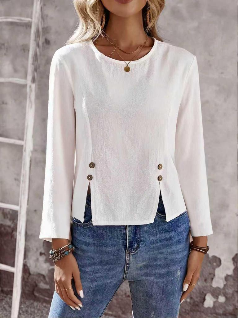 European White Long Sleeve Button-Decorated Split Casual Shirt