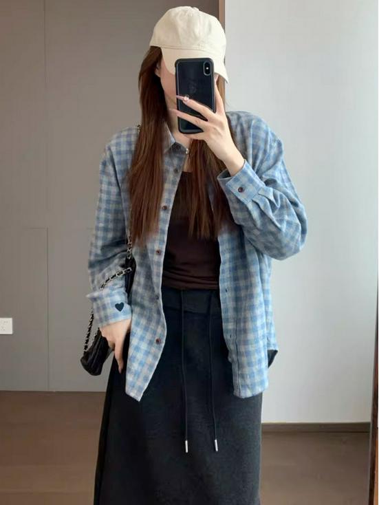 Blauw Ruitjes Hart Geborduurd Dik Katoen Lange Mouwen Shirt - Nieuwe Winter Collectie
