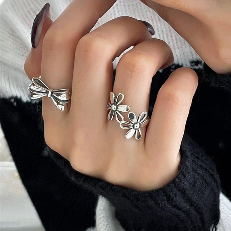 Y2K Vintage Flower Bowknot Open Ring for Women Metal Style Hollow Petals Silver Color Trendy Finger Accessories Fashion Jewelry