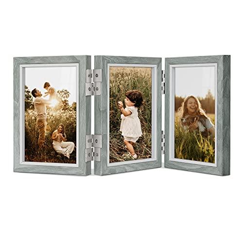 Afuly Wall-Mounted Photo Frame, 3-Panel, Postcard Compatible, Gray, Foldable, 360° Rotating, Wood Grain Finish, Perfect Gift for Weddings, Birthdays,