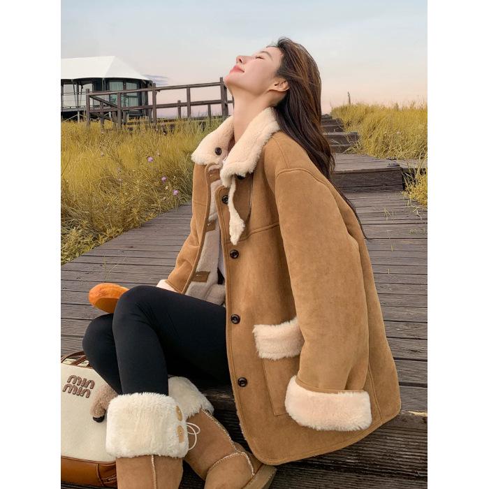 Korean Style Double-Sided Suede Jacket - Women's Winter 2026 Thick Lambswool and Leather Top