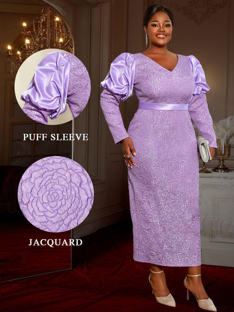 Plus Size Elegant Light Purple Jacquard Puff Sleeve Long Formal Dress.
