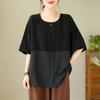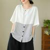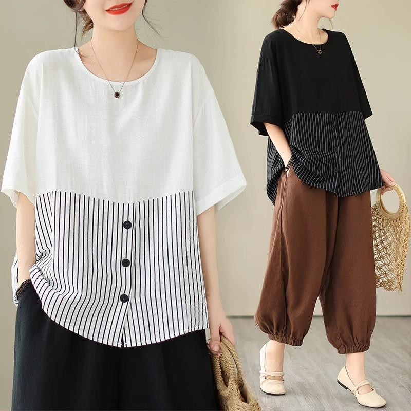 Plus Size Women's Retro Literary Pullover Loose and Thin Striped Blouse Stitching Short-sleeved T-shirt