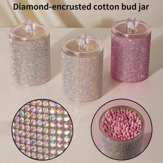 Dit elegante opbergpotje is ontworpen om uw kaptafel of badkamertoilet netjes en georganiseerd te houden, terwijl het waardevolle ruimte bespaart.. Gemaakt van massieve materialen en versierd met schitterende strass-steentjes, voegt het een vleugje verfijning en charme toe aan elke kamer.. Het veilige deksel voorkomt dat stof binnendringt, zodat uw wattenstaafjes, pads of andere kleine accessoires schoon en beschermd blijven..