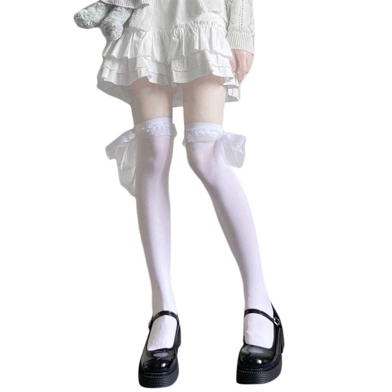 Over knee thigh high long stockings, simple solid color, sweet long ribbon bowknot decoration, elastic top cuffs.
