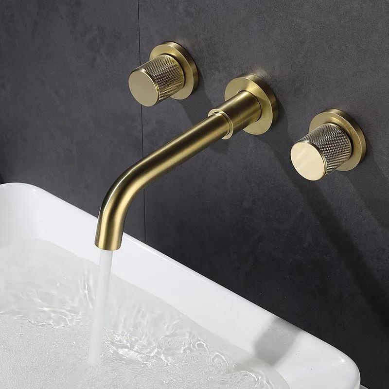 Bathroom Basin Faucet Brushed Gold/Black 2-Handle 3-Hole Wall Mounted Bathroom Sink Faucet Knurling Handle